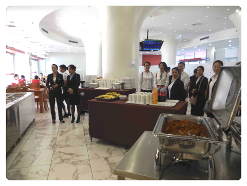 南宁同事在参观公寓机组餐厅,南宁鹏轩空勤公寓的餐厅主管已迫不及待地与餐厅吴主管探讨起管理经验。
