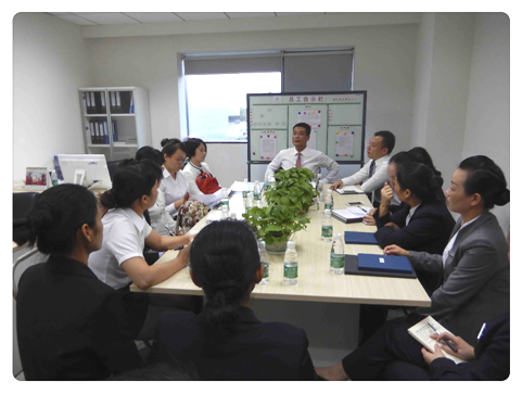 参观完毕,深圳鹏轩公寓与南宁鹏轩公寓的同事齐聚办公室座谈 。由深圳鹏轩空勤公寓各部门主管做小专题交流,互动,对口部门同事会后纷纷添加联系方式。