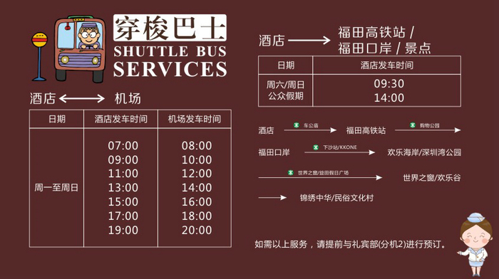 在日常工作中,通过自己帮助到了客人,从而收获来自客人的笑容及感谢是最开心的事情。深圳深航国际酒店是我第一个工作的地方,我也很开心在此发挥我的专业所长。每天我都会穿梭于酒店大堂,时刻为宾客解答疑惑,提供各式各样的协助。深圳深航国际酒店一直潜心打造成为阁下陆地上的头等舱。只希望令您在繁忙的商务出差中或度假旅行途中,能够感受到我们丝丝真诚暖意。酒店自4月1日起,往返于机场的穿梭巴士从每天上午7点起准时启程,每2个小时一班次,令您往返出行更便利。