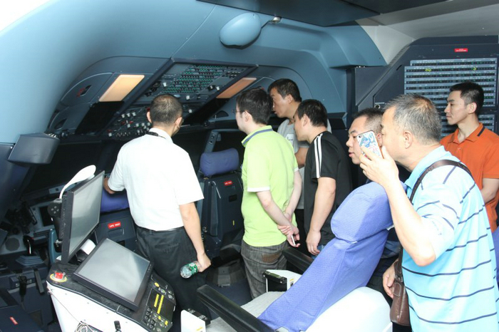 参观的首站是位于基地新东区的飞行培训楼,全新的大楼内矗立着两台空客A320和一台波音737模拟机, 这里培养出了众多优秀的飞行员。 讲解员向?嵩泵窍晗附樯芰朔尚性钡呐嘌蹋ü细竦难盗泛涂己耍庞锌赡艹晌幻鞣缪辖鞯纳钲诤娇辗尚性保?为每一位乘坐深圳航空的旅客保驾护航。
