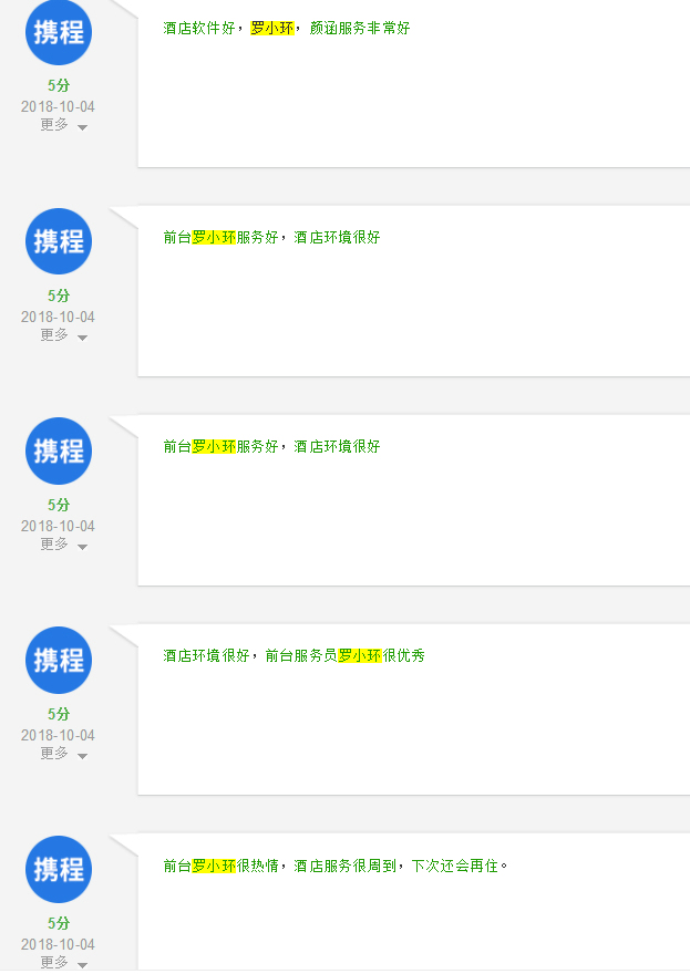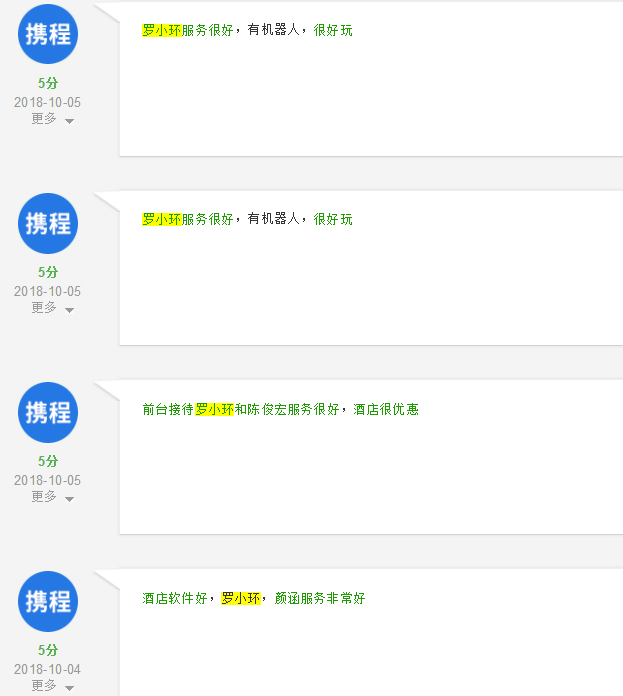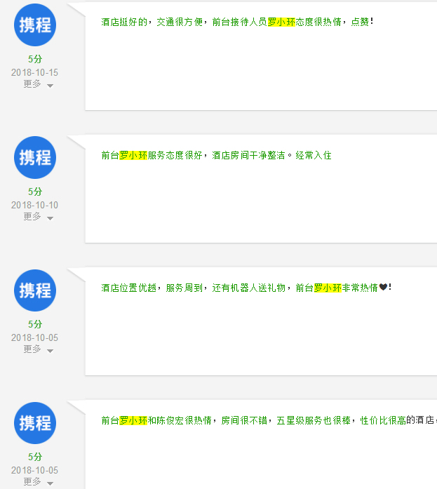 来自辽宁的苏先生,他对罗小环的认可让小环自己都觉得格外受宠若惊。由于前一天的入住登记是罗小环接待的,因此第二天他来退房的时候,小环看到他时便热情地询问其入住感受等,并快速地帮他处理好发票等退房手续,由于房间是由苏先生的太太预订的,他特意立即打电话给他太太,点名表扬了罗小环的优质服务并让他太太一定要给罗小环5分好评以示感谢。她谦虚地说:这是我的分内工作,能让客人在入住期间舒适,满意地离开,这对我已经是很好的认可。很感谢客人的真诚认可,这也将激励我继续保持初心,以优质的服务去赢得客人的口碑。
