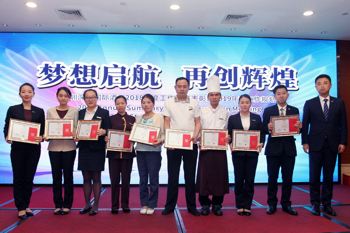 2019年2月26日,深圳深航国际酒店在五楼鲲鹏厅召开了“2018年度工作总结表彰暨2019年度工作规划会议”。酒店总经理黄俭、常务副总经理魏文斌、副总经理肖强及各部门总监、干职员工近350人出席了会议。大会上,常务副总经理魏文斌首先代表总经理室做了2018年度工作总结及2019年度工作计划报告,随后由副总经理肖强宣读了年度优秀团队和优秀个人的表彰通报。最后,总经理黄俭做了重要工作指示。