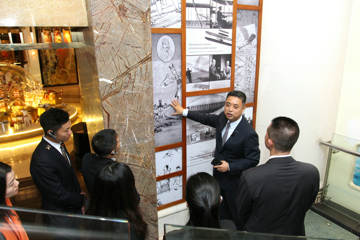 当天上午,肖强副总经理带领深圳桔钓沙莱华度假酒店的管理团队一行参观了酒店,从1楼大堂至顶层30楼总共历时1个多小时,通过前后台现场讲解使来宾们更加真切地感受到深圳深航国际酒店别具一格的航空文化主题、差异化的服务创新细节以及网络信息技术的大胆探索与应用。