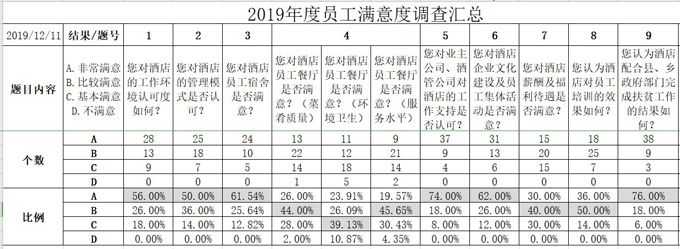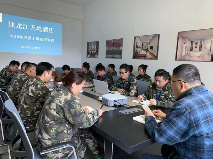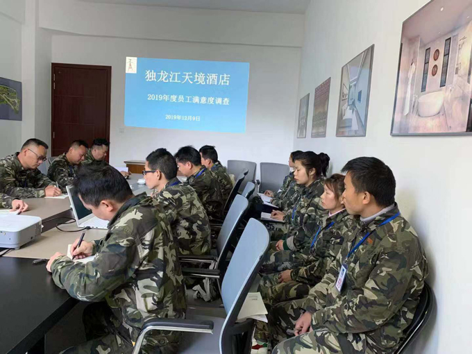 为全面掌握员工思想动态,倾听员工心声和了解员工需求,2019年12月9日,独龙江天境酒店开展了2019年度员工满意度调查活动。在张总的指导和部署下,各部门经理、各部门员工代表一起召开了专题会议,对本年度员工满意度调查的实施细节进行了宣贯。张总在会上希望全员从酒店及个人利益出发,在不同纬度上认真、详细、真实地填写调查问卷,并强调本次调查将采取不记名的方式进行填报,酒店将为每位员工严格保密。