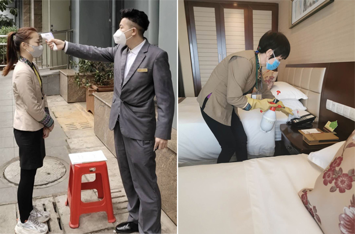 图:员工体温检测、客房消毒