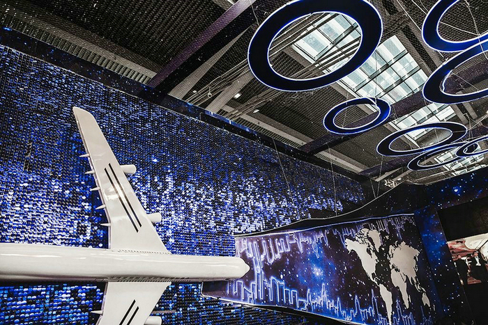 本次展会的面积约30000㎡,汇聚了婚纱摄影、婚礼策划、婚纱礼服、珠宝首饰、婚宴酒店、婚礼用品等领军品牌。深圳深航国际酒店展位将航空文化的主题,通过科技风加以渲染,更显大气非凡。 展位背景上气势恢宏的大型定制机模和繁星点点的世界航线地图吸引了众多观展人士与新人驻足欣赏及拍照分享,极具吸睛效果。