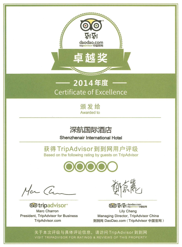 日前,根据全球最大旅游点评网——到到网(TripAdvisor中国官网)所收集的酒店服务质量数据旅行者点评统计结果显示,深圳深航国际酒店被全球众多旅行者给予了高度评价,在全球旅行者口碑中表现的非常出色,因此蝉联2014年度到到网(TripAdviso中国官网)“卓越奖”殊荣。