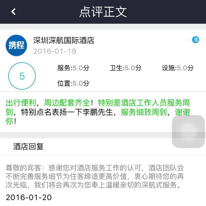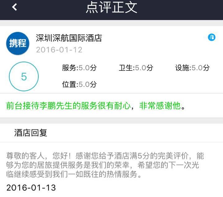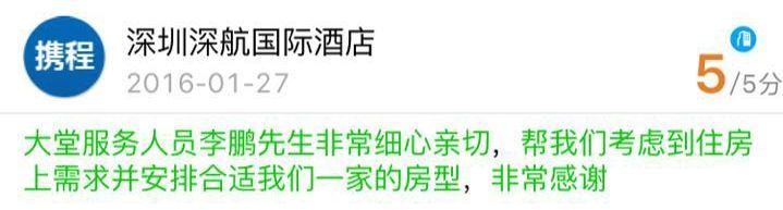面前这位帅气腼腆的男生,入职深圳深航国际酒店不到2年,却赢得了多位客户的点赞。李鹏,2014年加入酒店礼宾部,2015年8月份,个人提出申请转到前厅部学习,在前台刚满半年了,不仅承受住一线前台的高压挑战,更是赢得了客户的满意!以下五分点评你们随意感受下,此处应该有掌声!!!