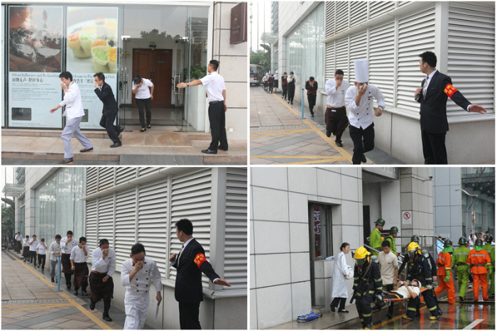 7月7日15:00时左右,深圳深航国际酒店6楼康体中心仓库区域内发生火灾。担任此次消防演习总指挥的魏文斌常务副总经理接到报告后立即指令向119报警,并启动紧急疏散预案。整个现场的楼层及通道内浓烟滚滚。各部门各司其职,在酒店义务消防队的组织下,酒店康体中心客人和5楼鲲鹏厅300多人会议客人迅速用衣物或毛巾捂住口鼻,有的则披着湿浴巾,或弯着腰,或匍匐前进,沿着消防疏散指示标志有序地从消防楼梯中快速撤离。现役公安武警消防部队接到报警以最快速度到达酒店,立即启动消防车水炮实施高空灭火作业并派出搜救组展开救援,最终大火被扑灭,并成功解救被困人员。整个演练过程实施顺畅,时长15分钟。