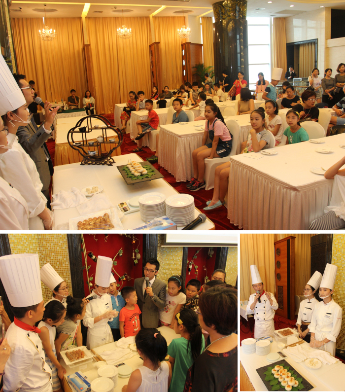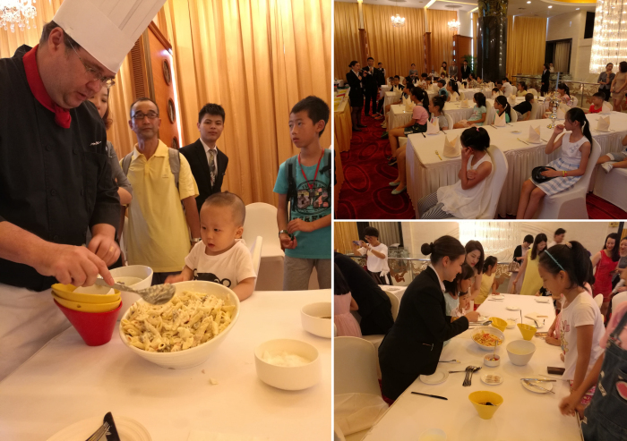 与此同时,西餐制作及西餐礼仪培训也在进行中,由来自加拿大的外籍行政主厨、外籍实习生与小朋友们一起互动制作简易西餐美食,小朋友分为几组比拼才艺,活动现场气氛非常活跃。