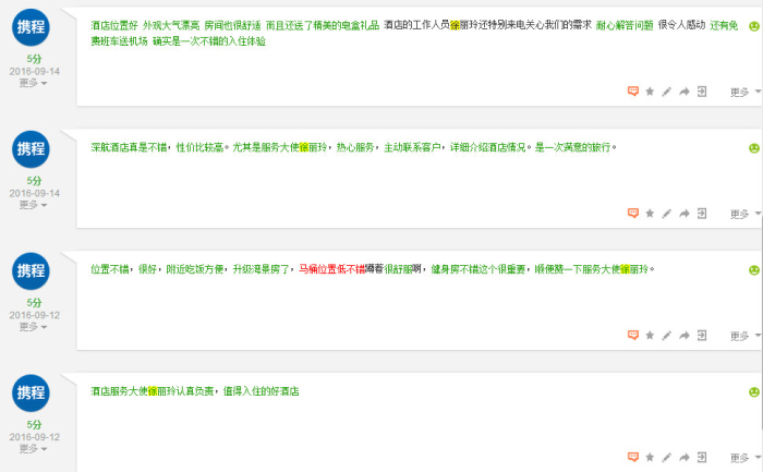 如今回首,徐丽玲十个月的工作生涯,工作日渐上手熟悉,稳稳地一步步成长,就如她说:这里有熟悉的同学、有温暖的同事、有喜爱的工作、有支持的家人,还有无数鼓励自己的客人,这是一份美好而值得期待的工作。而她的真诚付出,也在金秋九月,收获了整整10个满分的5分点评,赞赞!