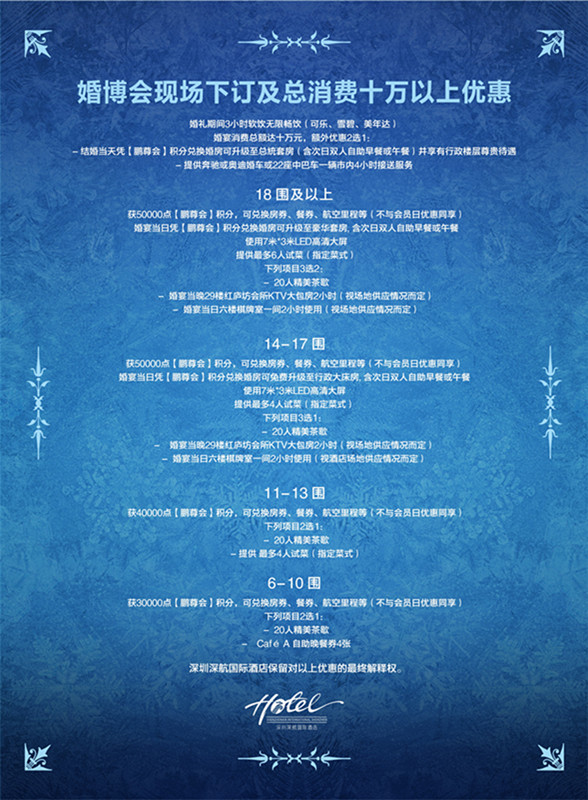 1、满十围送一围,二十围送二围的优惠;2、婚礼当天入住酒店总统套房。